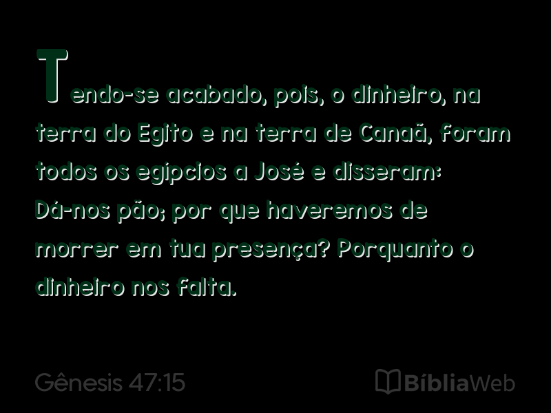 15Tendo-se acabado, pois, o dinheiro, na terra do Egito e na terra de Canaã, foram todos os egípcios a José e disseram: Dá-nos pão; por que haveremos de morrer em tua presença? Porquanto o dinheiro nos falta.