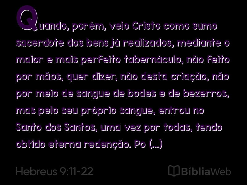 não por meio de sangue de bodes e de bezerros, mas pelo seu próprio sangue, entrou no Santo dos Santos, uma vez por todas, tendo obtido eterna redenção.