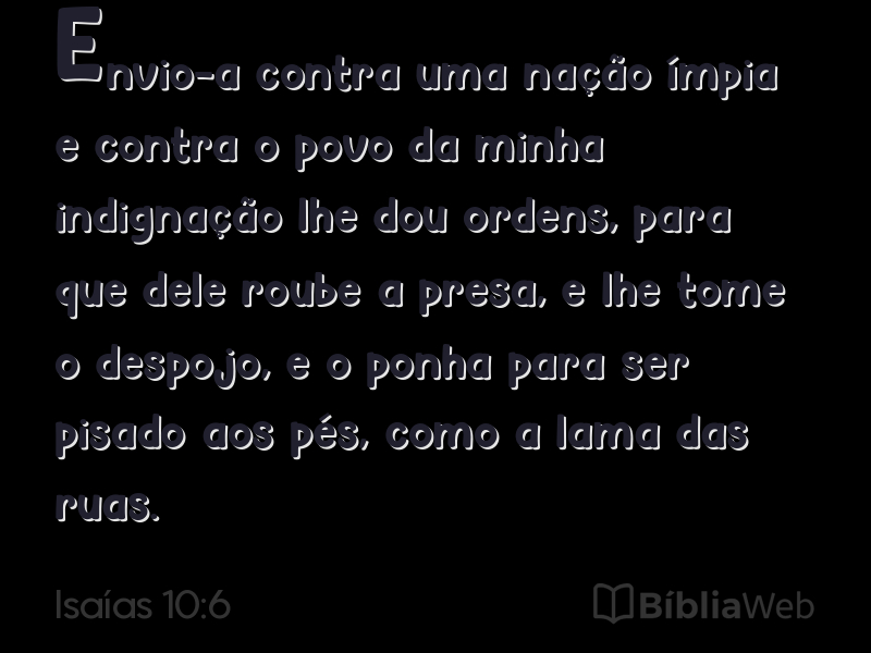 6Envio-a contra uma nação ímpia e contra o povo da minha indignação lhe dou ordens, para que dele roube a presa, e lhe tome o despojo, e o ponha para ser pisado aos pés, como a lama das ruas.