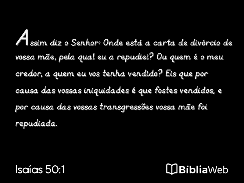 1Assim diz o Senhor: Onde está a carta de divórcio de vossa mãe, pela qual eu a repudiei? Ou quem é o meu credor, a quem eu vos tenha vendido? Eis que por causa das vossas iniquidades é que fostes vendidos, e por causa das vossas transgressões vossa mãe foi repudiada.