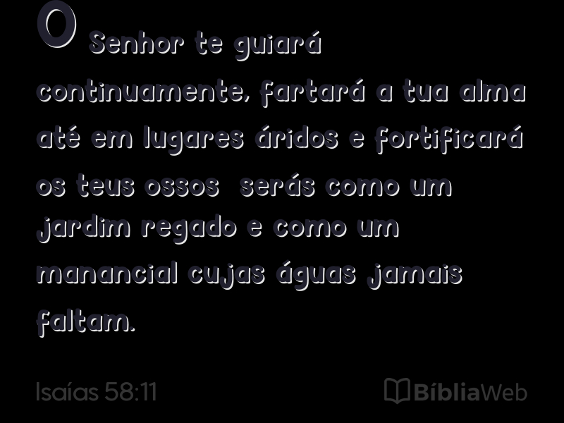 11O Senhor te guiará continuamente, fartará a tua alma até em lugares áridos e fortificará os teus ossos; serás como um jardim regado e como um manancial cujas águas jamais faltam.