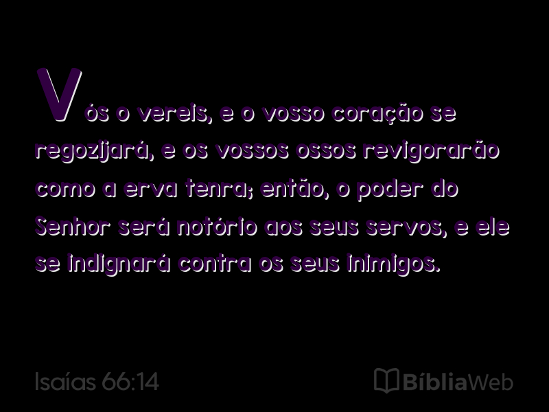 14Vós o vereis, e o vosso coração se regozijará, e os vossos ossos revigorarão como a erva tenra; então, o poder do Senhor será notório aos seus servos, e ele se indignará contra os seus inimigos.