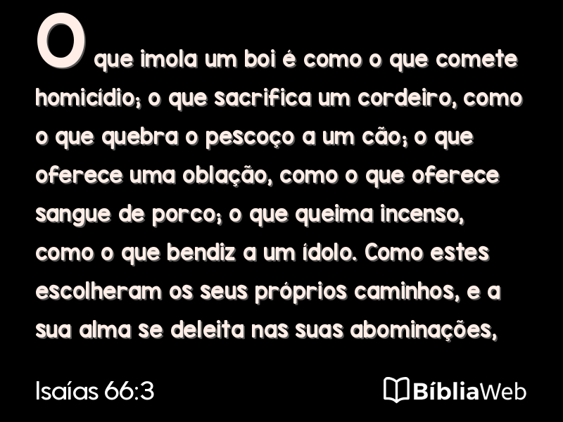3O que imola um boi é como o que comete homicídio; o que sacrifica um cordeiro, como o que quebra o pescoço a um cão; o que oferece uma oblação, como o que oferece sangue de porco; o que queima incenso, como o que bendiz a um ídolo. Como estes escolheram os seus próprios caminhos, e a sua alma se deleita nas suas abominações,