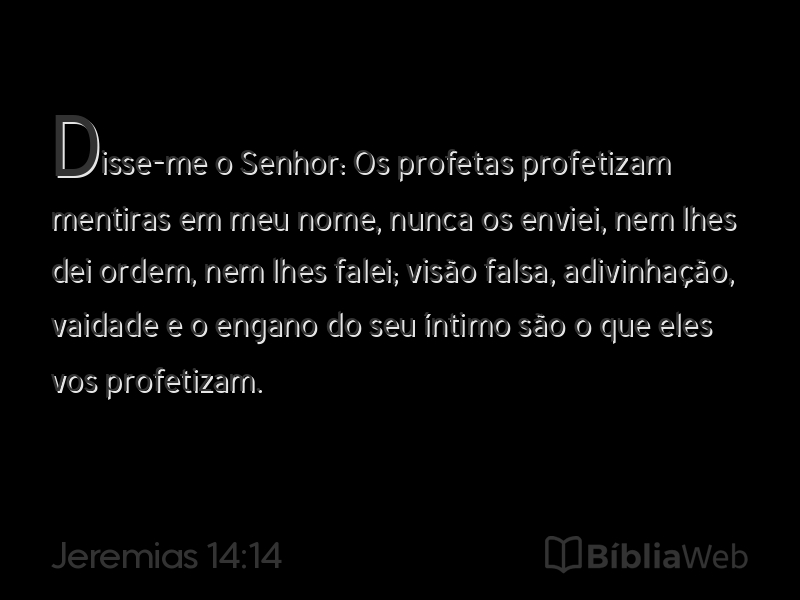 14Disse-me o Senhor: Os profetas profetizam mentiras em meu nome, nunca os enviei, nem lhes dei ordem, nem lhes falei; visão falsa, adivinhação, vaidade e o engano do seu íntimo são o que eles vos profetizam.