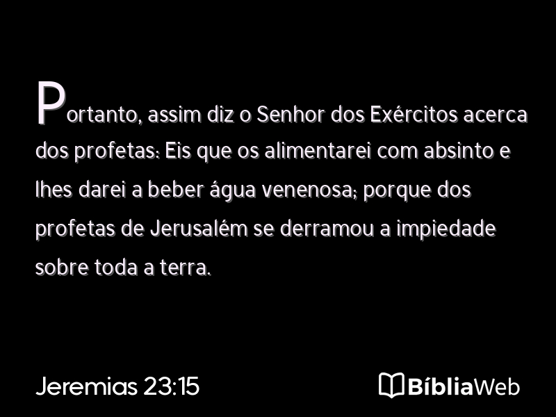 15Portanto, assim diz o Senhor dos Exércitos acerca dos profetas: Eis que os alimentarei com absinto e lhes darei a beber água venenosa; porque dos profetas de Jerusalém se derramou a impiedade sobre toda a terra.