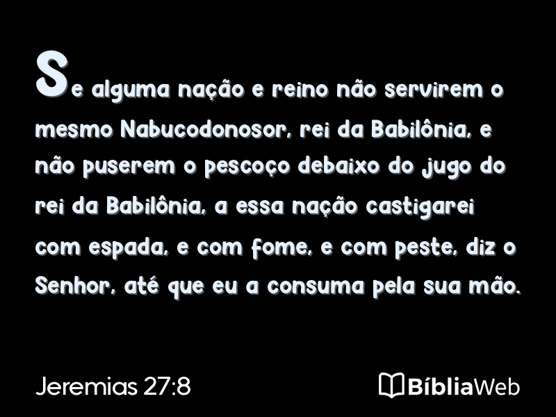 8Se alguma nação e reino não servirem o mesmo Nabucodonosor, rei da Babilônia, e não puserem o pescoço debaixo do jugo do rei da Babilônia, a essa nação castigarei com espada, e com fome, e com peste, diz o Senhor, até que eu a consuma pela sua mão.