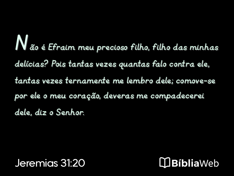 20Não é Efraim meu precioso filho, filho das minhas delícias? Pois tantas vezes quantas falo contra ele, tantas vezes ternamente me lembro dele; comove-se por ele o meu coração, deveras me compadecerei dele, diz o Senhor.