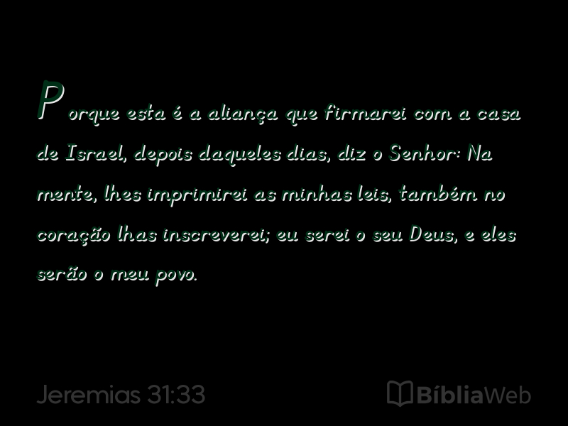 33Porque esta é a aliança que firmarei com a casa de Israel, depois daqueles dias, diz o Senhor: Na mente, lhes imprimirei as minhas leis, também no coração lhas inscreverei; eu serei o seu Deus, e eles serão o meu povo.