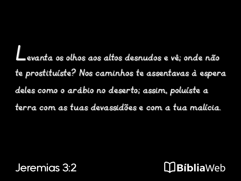 2Levanta os olhos aos altos desnudos e vê; onde não te prostituíste? Nos caminhos te assentavas à espera deles como o arábio no deserto; assim, poluíste a terra com as tuas devassidões e com a tua malícia.