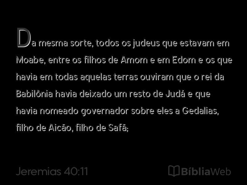 11Da mesma sorte, todos os judeus que estavam em Moabe, entre os filhos de Amom e em Edom e os que havia em todas aquelas terras ouviram que o rei da Babilônia havia deixado um resto de Judá e que havia nomeado governador sobre eles a Gedalias, filho de Aicão, filho de Safã;