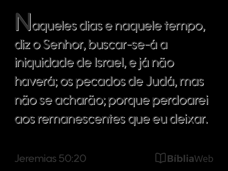 20Naqueles dias e naquele tempo, diz o Senhor, buscar-se-á a iniquidade de Israel, e já não haverá; os pecados de Judá, mas não se acharão; porque perdoarei aos remanescentes que eu deixar.