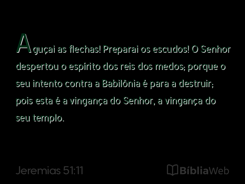 11Aguçai as flechas! Preparai os escudos! O Senhor despertou o espírito dos reis dos medos; porque o seu intento contra a Babilônia é para a destruir; pois esta é a vingança do Senhor, a vingança do seu templo.