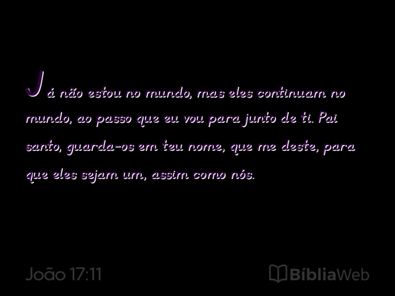 11Já não estou no mundo, mas eles continuam no mundo, ao passo que eu vou para junto de ti. Pai santo, guarda-os em teu nome, que me deste, para que eles sejam um, assim como nós.