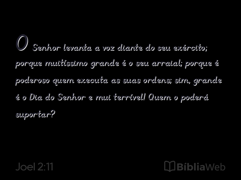 11O Senhor levanta a voz diante do seu exército; porque muitíssimo grande é o seu arraial; porque é poderoso quem executa as suas ordens; sim, grande é o Dia do Senhor e mui terrível! Quem o poderá suportar?