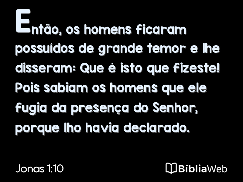 10Então, os homens ficaram possuídos de grande temor e lhe disseram: Que é isto que fizeste! Pois sabiam os homens que ele fugia da presença do Senhor, porque lho havia declarado.