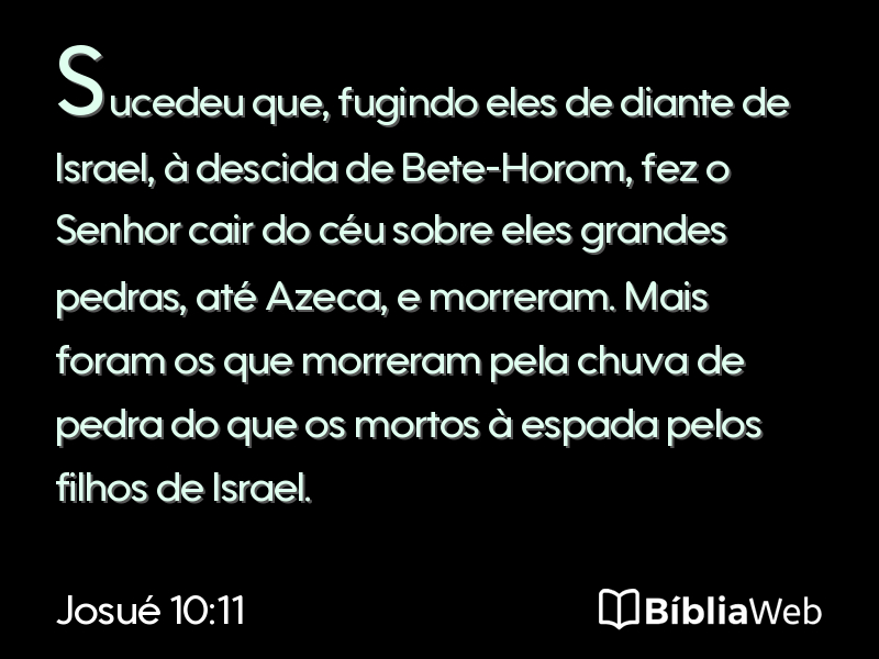 11Sucedeu que, fugindo eles de diante de Israel, à descida de Bete-Horom, fez o Senhor cair do céu sobre eles grandes pedras, até Azeca, e morreram. Mais foram os que morreram pela chuva de pedra do que os mortos à espada pelos filhos de Israel.