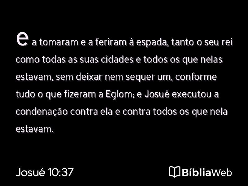 37e a tomaram e a feriram à espada, tanto o seu rei como todas as suas cidades e todos os que nelas estavam, sem deixar nem sequer um, conforme tudo o que fizeram a Eglom; e Josué executou a condenação contra ela e contra todos os que nela estavam.