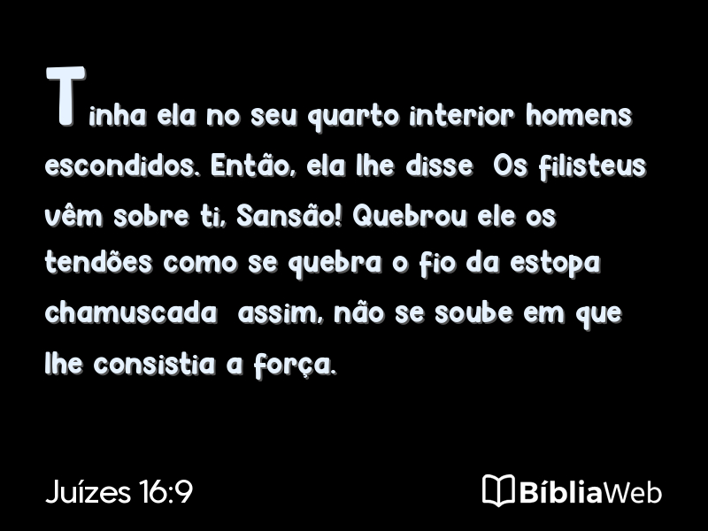 9Tinha ela no seu quarto interior homens escondidos. Então, ela lhe disse: Os filisteus vêm sobre ti, Sansão! Quebrou ele os tendões como se quebra o fio da estopa chamuscada; assim, não se soube em que lhe consistia a força.