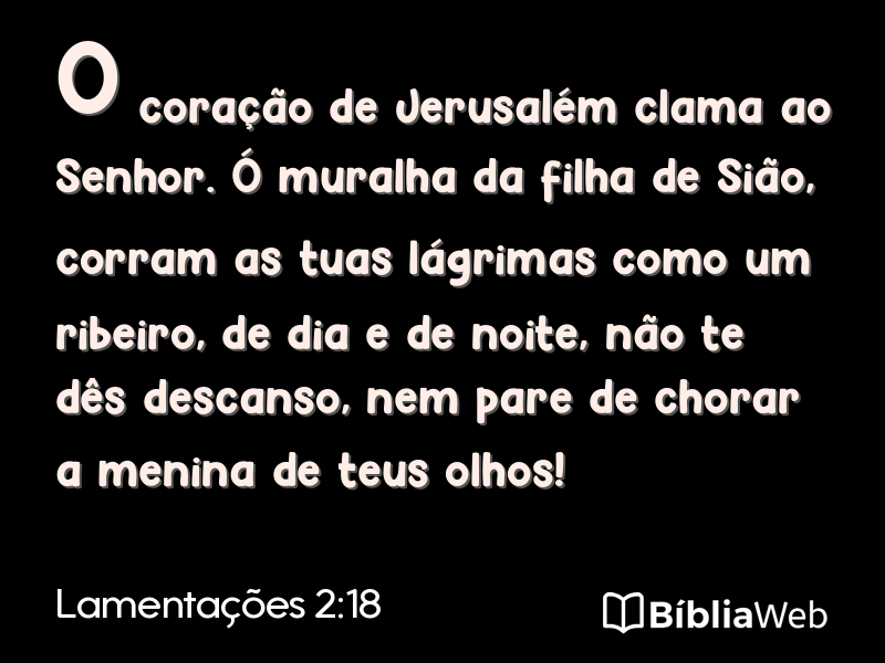 18O coração de Jerusalém clama ao Senhor. Ó muralha da filha de Sião, corram as tuas lágrimas como um ribeiro, de dia e de noite, não te dês descanso, nem pare de chorar a menina de teus olhos!