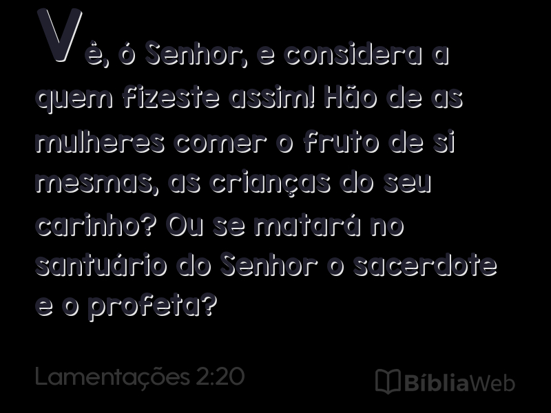 20Vê, ó Senhor, e considera a quem fizeste assim! Hão de as mulheres comer o fruto de si mesmas, as crianças do seu carinho? Ou se matará no santuário do Senhor o sacerdote e o profeta?