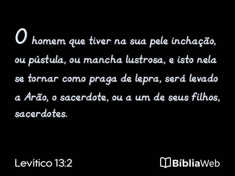2O homem que tiver na sua pele inchação, ou pústula, ou mancha lustrosa, e isto nela se tornar como praga de lepra, será levado a Arão, o sacerdote, ou a um de seus filhos, sacerdotes.