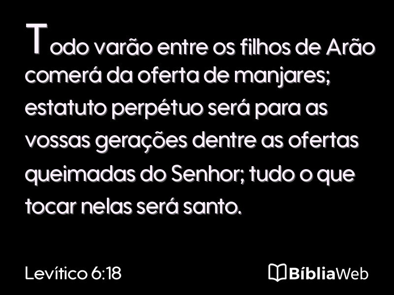 18Todo varão entre os filhos de Arão comerá da oferta de manjares; estatuto perpétuo será para as vossas gerações dentre as ofertas queimadas do Senhor; tudo o que tocar nelas será santo.