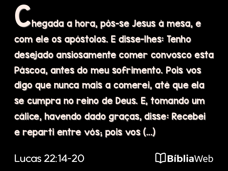 E, tomando um pão, tendo dado graças, o partiu e lhes deu, dizendo: Isto é o meu corpo oferecido por vós; fazei isto em memória de mim.