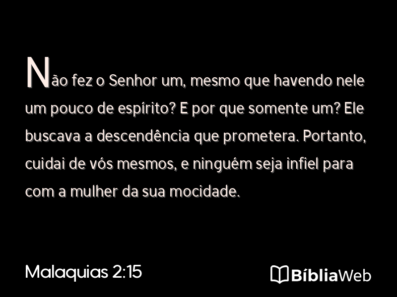 15Não fez o Senhor um, mesmo que havendo nele um pouco de espírito? E por que somente um? Ele buscava a descendência que prometera. Portanto, cuidai de vós mesmos, e ninguém seja infiel para com a mulher da sua mocidade.