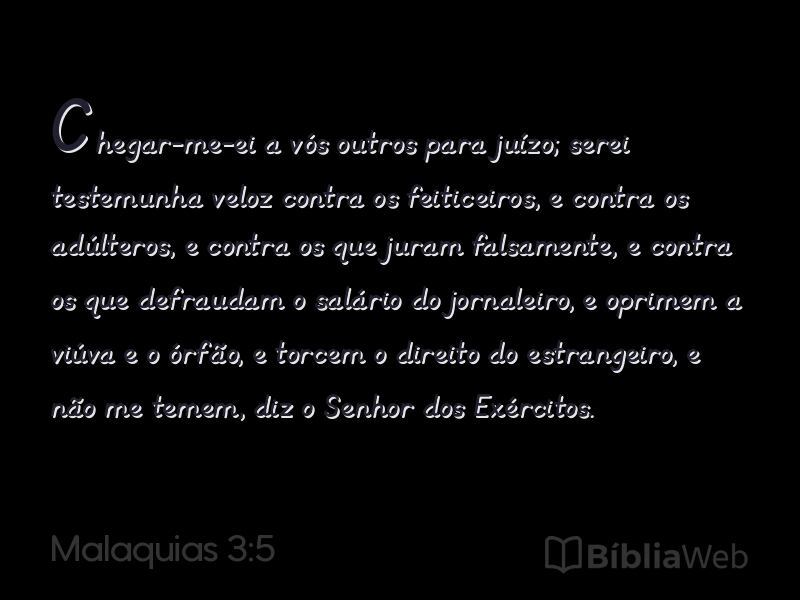 5Chegar-me-ei a vós outros para juízo; serei testemunha veloz contra os feiticeiros, e contra os adúlteros, e contra os que juram falsamente, e contra os que defraudam o salário do jornaleiro, e oprimem a viúva e o órfão, e torcem o direito do estrangeiro, e não me temem, diz o Senhor dos Exércitos.