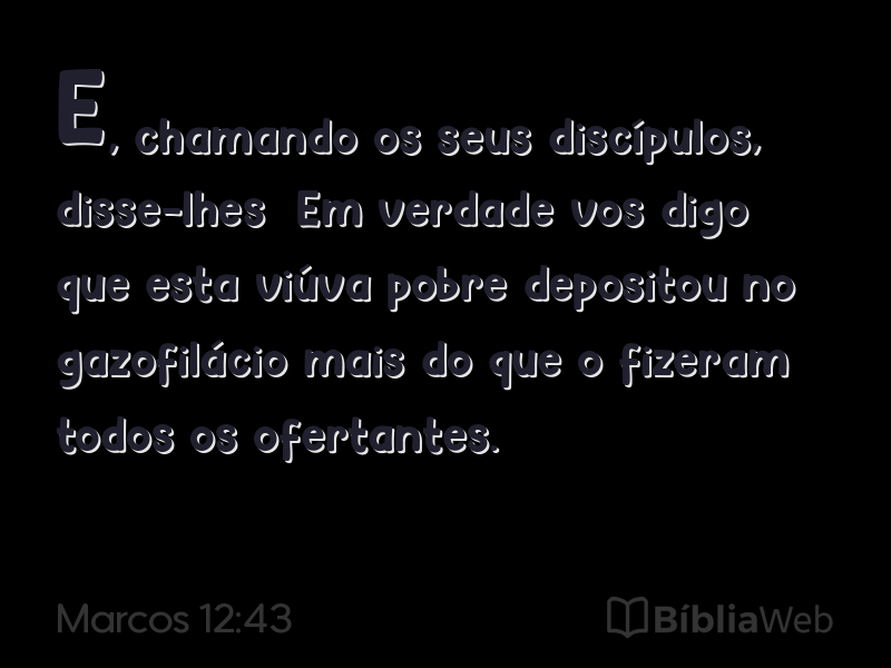 43E, chamando os seus discípulos, disse-lhes: Em verdade vos digo que esta viúva pobre depositou no gazofilácio mais do que o fizeram todos os ofertantes.