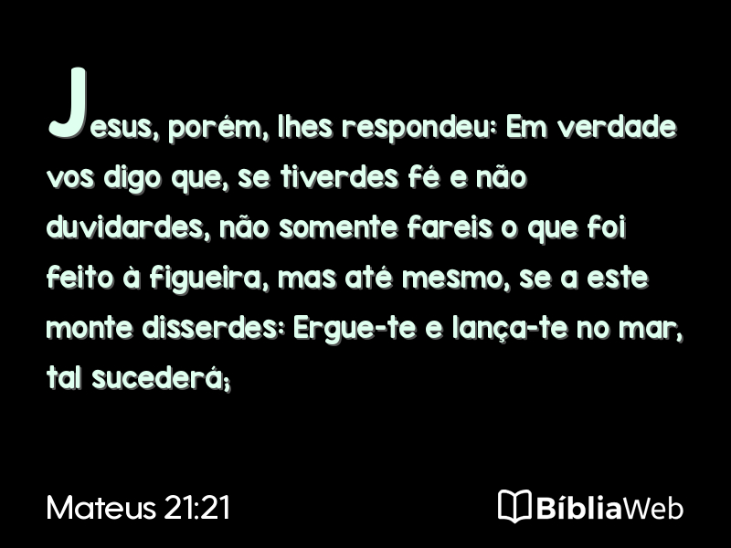 21Jesus, porém, lhes respondeu: Em verdade vos digo que, se tiverdes fée não duvidardes, não somente fareis o que foi feito à figueira, mas até mesmo, se a este monte disserdes: Ergue-te e lança-te no mar, tal sucederá;