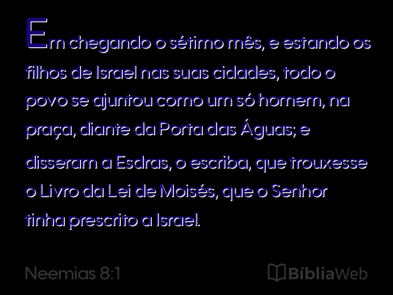 1Em chegando o sétimo mês, e estando os filhos de Israel nas suas cidades, todo o povo se ajuntou como um só homem, na praça, diante da Porta das Águas; e disseram a Esdras, o escriba, que trouxesse o Livro da Lei de Moisés, que o Senhor tinha prescrito a Israel.