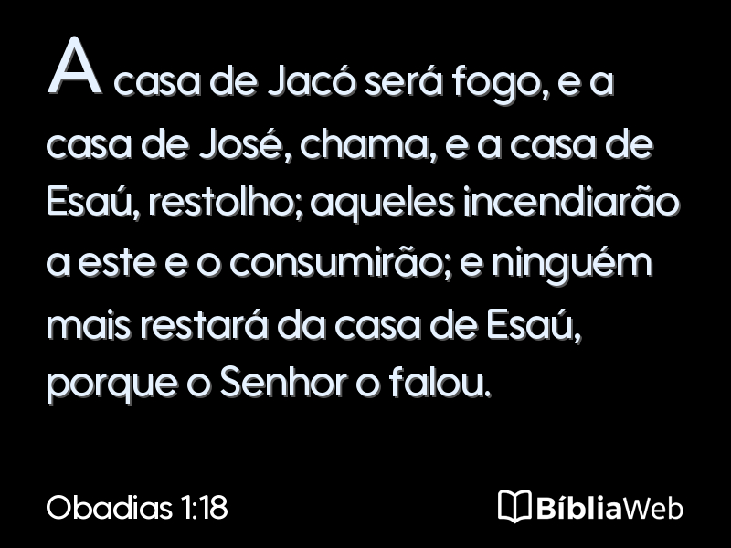 18A casa de Jacó será fogo, e a casa de José, chama, e a casa de Esaú, restolho; aqueles incendiarão a este e o consumirão; e ninguém mais restará da casa de Esaú, porque o Senhor o falou.