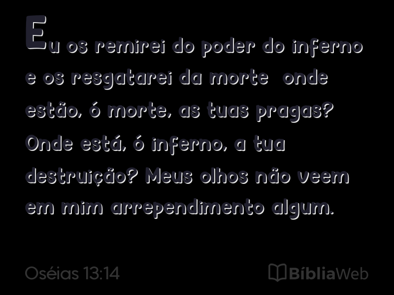 14Eu os remirei do poder do inferno e os resgatarei da morte; onde estão, ó morte, as tuas pragas? Onde está, ó inferno, a tua destruição? Meus olhos não veem em mim arrependimento algum.