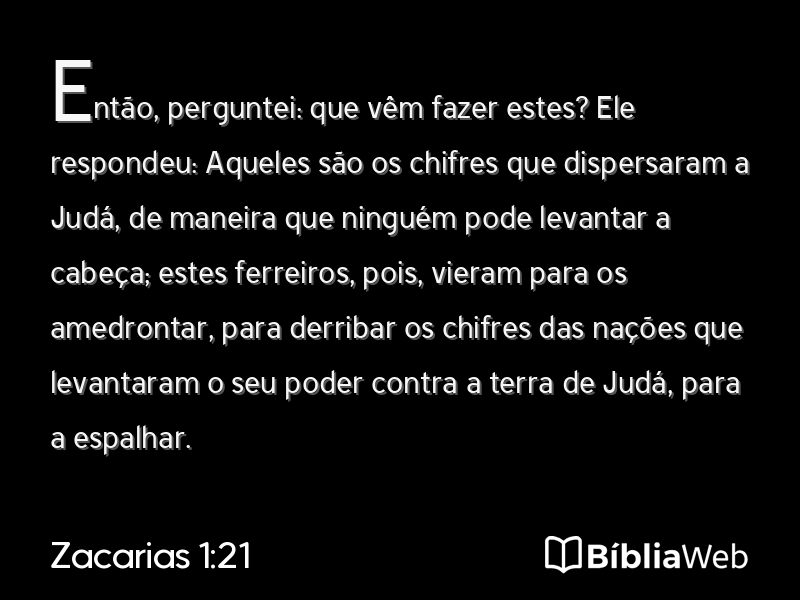 21Então, perguntei: que vêm fazer estes? Ele respondeu: Aqueles são os chifres que dispersaram a Judá, de maneira que ninguém pode levantar a cabeça; estes ferreiros, pois, vieram para os amedrontar, para derribar os chifres das nações que levantaram o seu poder contra a terra de Judá, para a espalhar.